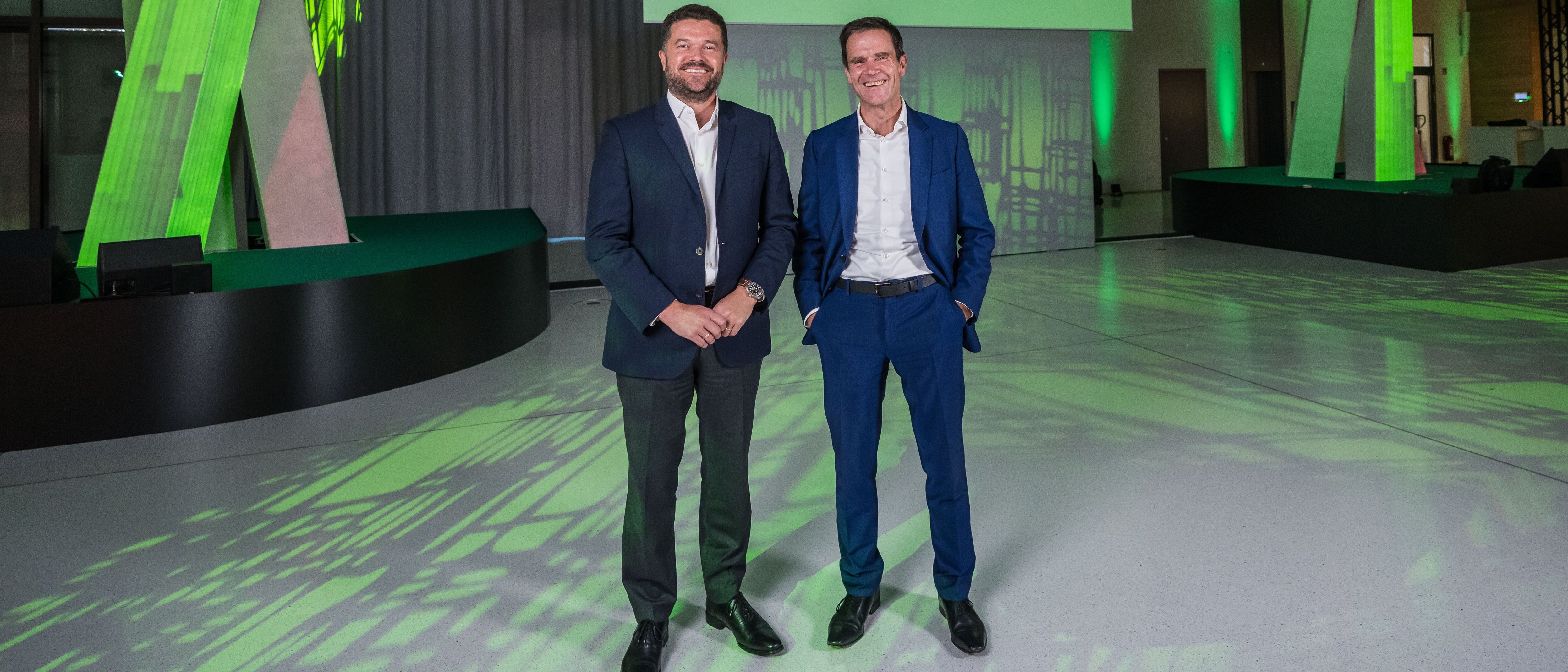 Bild: Jon Morrish, Mitglied des Vorstands und verantwortlich für die Markenentwicklung, sowie Dr. Dominik von Achten, Vorstandsvorsitzender (v.l.), enthüllten am Hauptsitz die neue Marke „Heidelberg Materials“.